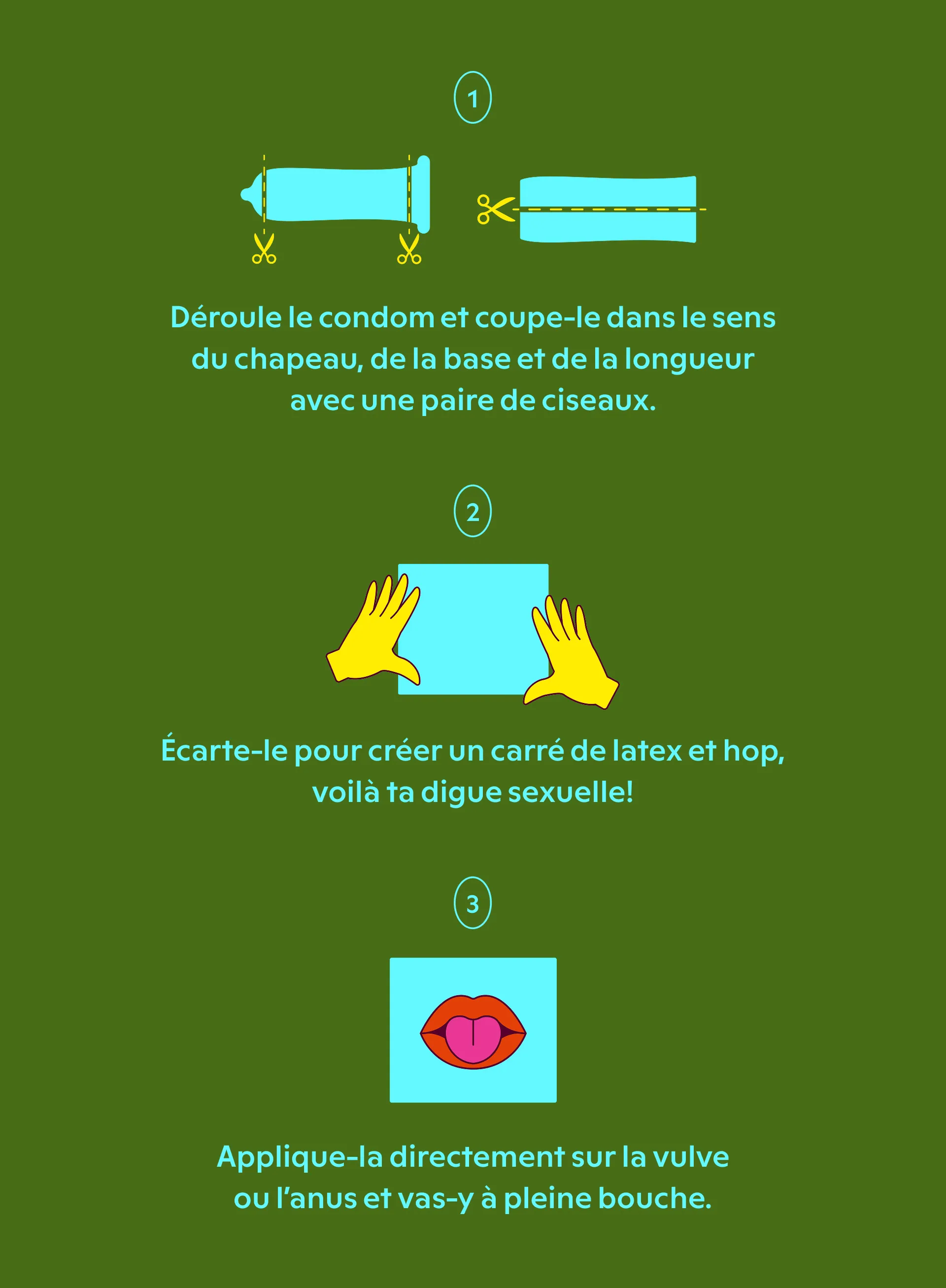 Si tu fais un cunnilingus ou un anulingus, il faut prévoir une digue sexuelle, un petit carré de latex que tu peux appliquer sur la vulve ou l’anus avant de les stimuler avec la bouche ou la langue. Tu peux en trouver en boutique spécialisée, ou en fabriquer une à partir de ta sorte de condom préférée :