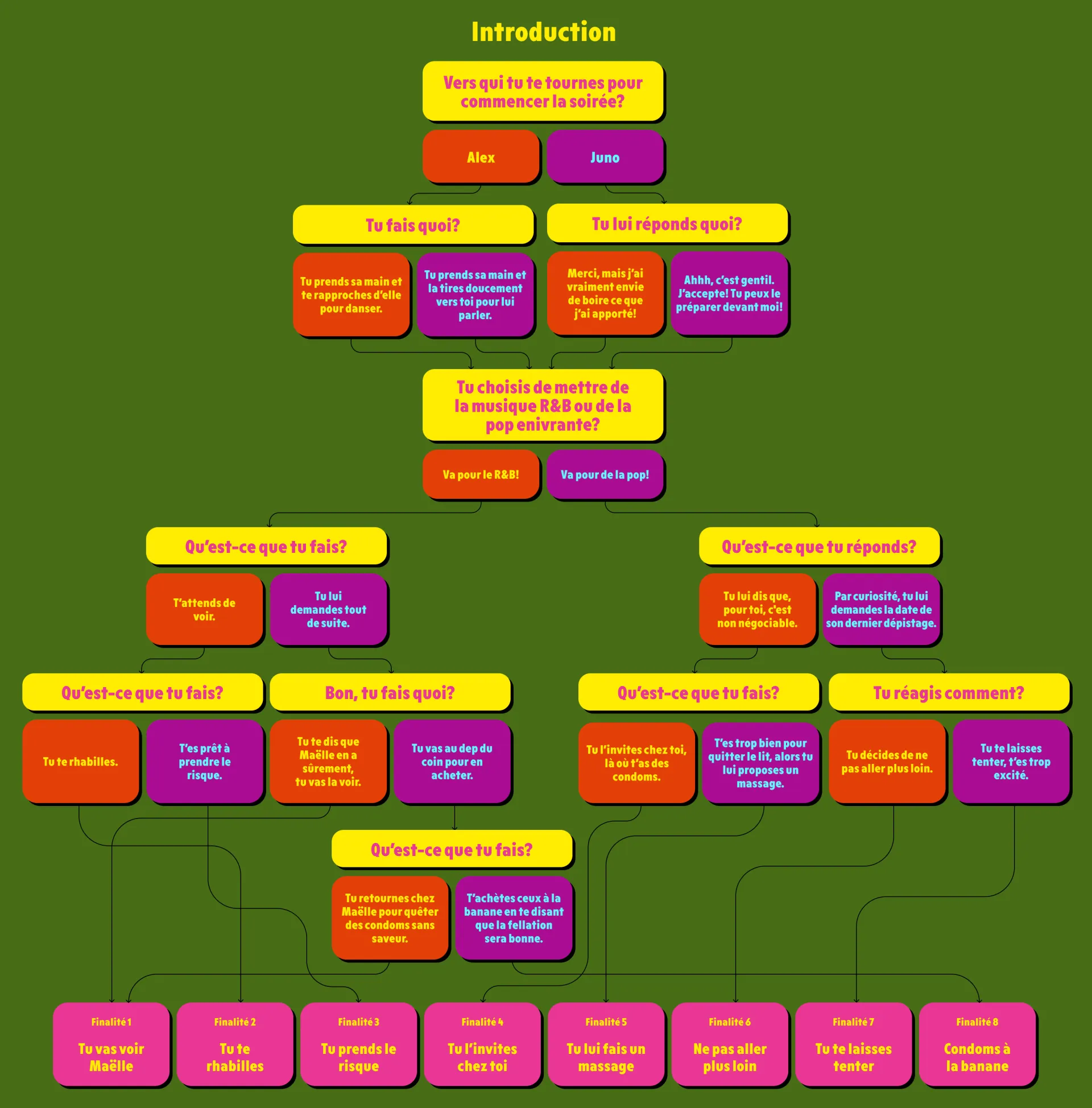 Au fil des péripéties, des enjeux liés à l’utilisation du condom et au dépistage des ITSS amènent le personnage à se questionner sur les bonnes actions à poser. À la fin de chaque chapitre, le ou la joueur·euse a 2 options et doit faire un choix. À partir du chapitre 5, les décisions à prendre concernent la santé sexuelle. Chaque choix impacte le déroulement de l’histoire.